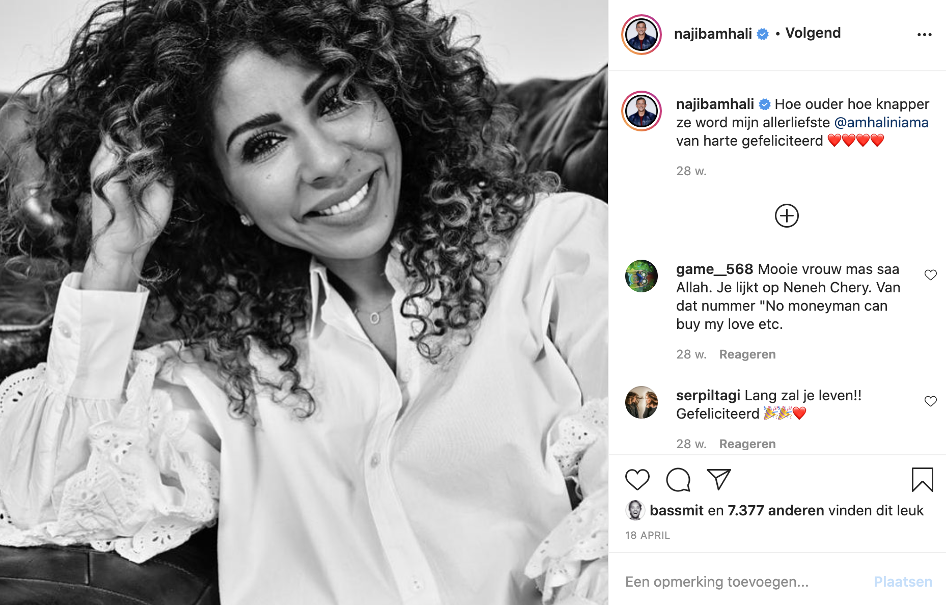 Jarige vrouw. Najib en de rest van zijn gezin vieren vandaag feest, want Niama Amhali, de vrouw van Najib, is vandaag jarig. Op Instagram plaatst de cabaretier een hele mooie foto en hij schrijft de lieve woorden: 'Lieve @amhaliniama we houden zo veel van jou. Noah Novèll en Najib.